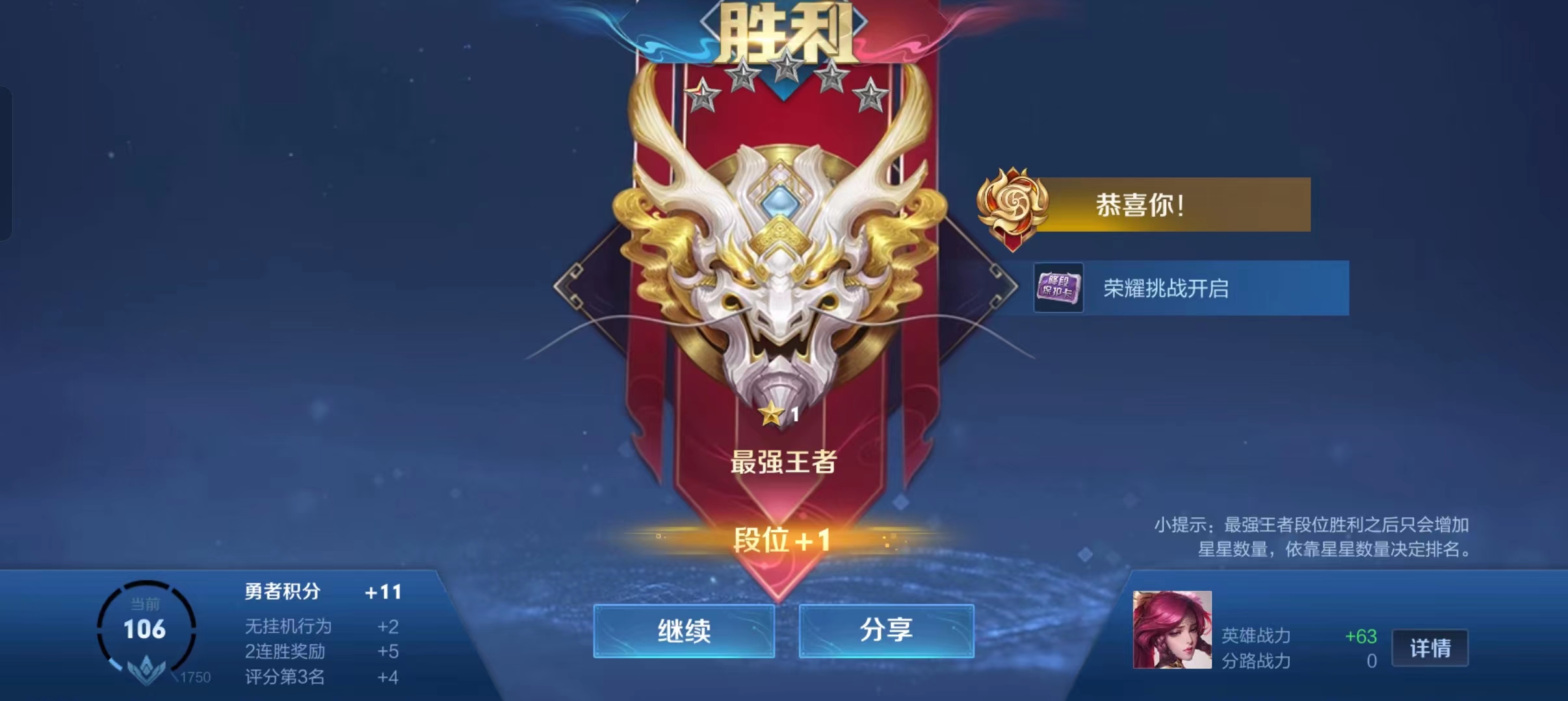 10月末11月初, 甜蜜的刚到周一又感冒了, 巨难受, 那天去上算法课, 听不进去, 胸口很闷, 头有些晕. 于是再次不想去工位, 已经连续三周没去工位了. 从星耀5到星耀3都是玩的露娜, 输出装露娜也熟练了. 但在星耀3卡住了, 于是再次请出伽罗, 胜率依然保存在70%以上, 有一次7连胜到晋级赛, 晋级失败后, 王者荣耀送了我一个5连败, 赢了一场后再送我一个4连败, 心态大崩, 心态大崩后放弃伽罗玩露娜, 昨天一直玩的露娜, 我发现我露娜就星耀3左右的水平, 艰难地维持在星耀2的段位, 今天还是用伽罗, 拿了近一半的mvp, 上了王者. 19天上王者, 要是我不玩露娜只玩伽罗的话, 可能10天不到就能从0上王者.